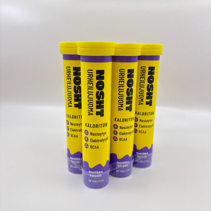 Nosht Kaloriton urheilujuoma on energiaton poretablettiversio rakastetusta urheilujuomastamme: se sisältää kaikki tarvitsemasi elektrolyytit, imeytyy tehokkaasti ja on hellä vatsalle. Mustikan ja Karpalon maku leikkaa miellyttävästi juoman mineraalisuutta, joten juoma maistuu koko päivän ajan!